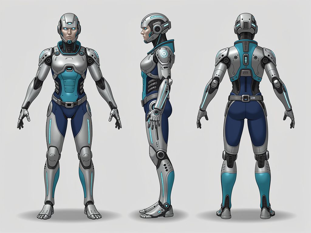 Multi-view character reference sheet with front, side, and detail views on a neutral background.