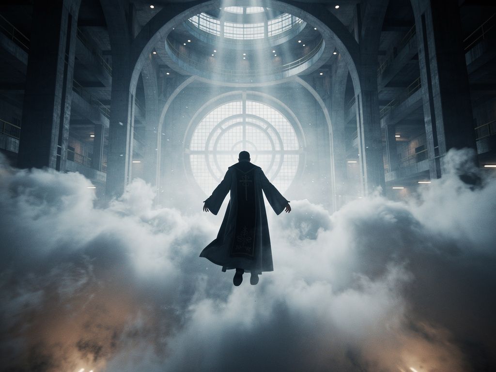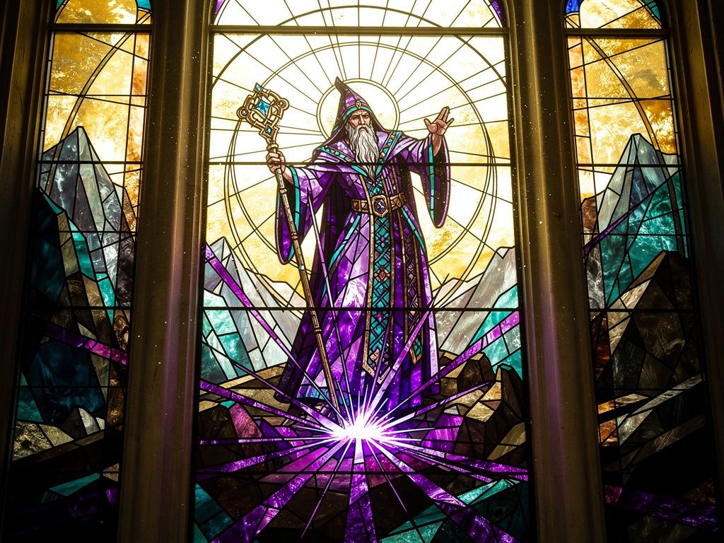 Stained-glass and sacred illumination aesthetic — radiant god-rays, rich jewel tones, and spiritual geometry.
