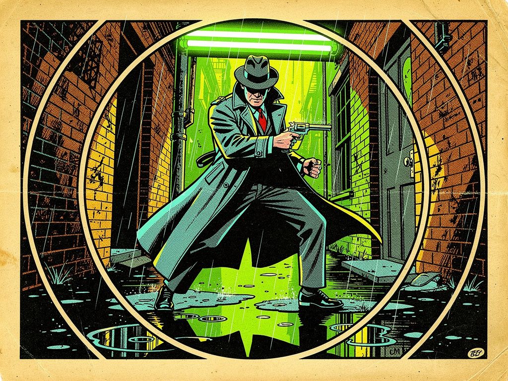 Vintage comic-book printing with bold halftone dots, limited ink colors, and pulp-era drama.