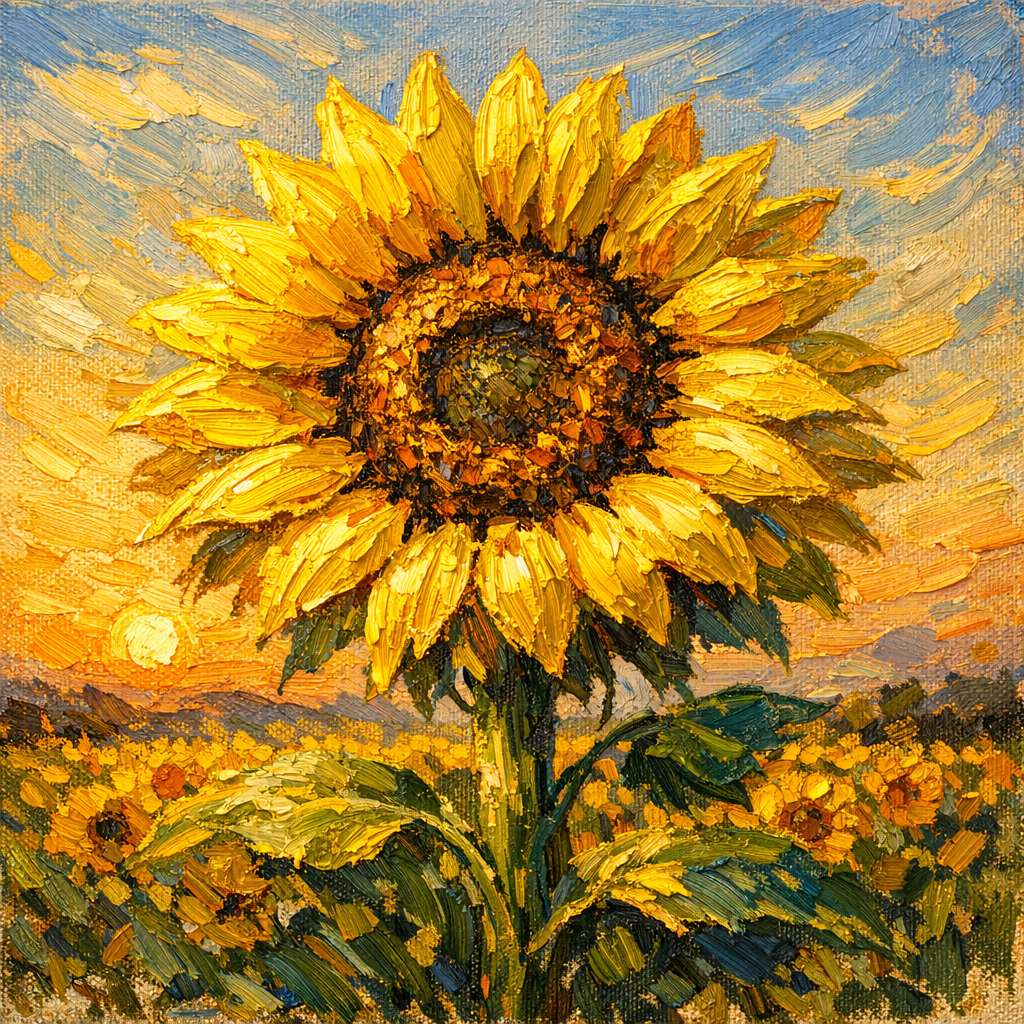 Thick oil paint applied with a palette knife — bold, textured strokes and rich painterly surfaces.