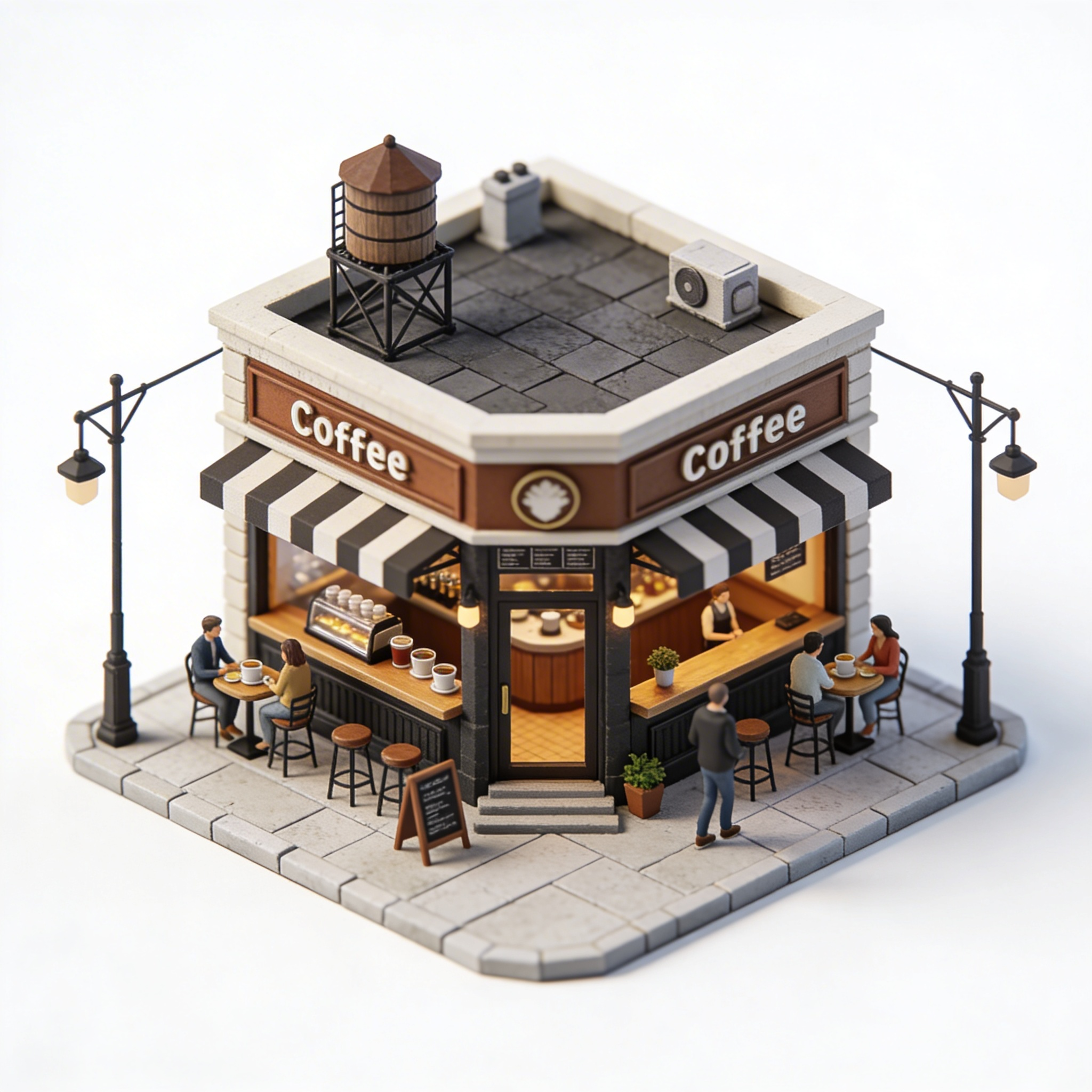 Crisp isometric dioramas with precise orthographic geometry, pastel palettes, and cute proportions.